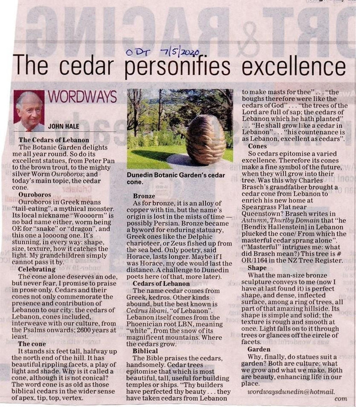 Dr John Hale who is the Otago Daily Times WordWays columnist, wrote this lovely piece called 'The Cedar Personifies Excellence' about our Bronze Cedar Cone at the Dunedin Botanic Garden.