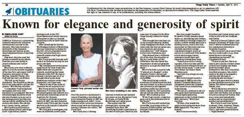 On Saturday April 27th, in the ODT newspaper, there was a beautiful obituary for Pamela Farry. I have pasted the text from the article below, as the attached picture is a little hard to read. You're always in our hearts, Pam. Obituary: Known for Elegance and Generosity of Spirit PAMELA DIANA FARRY Model …