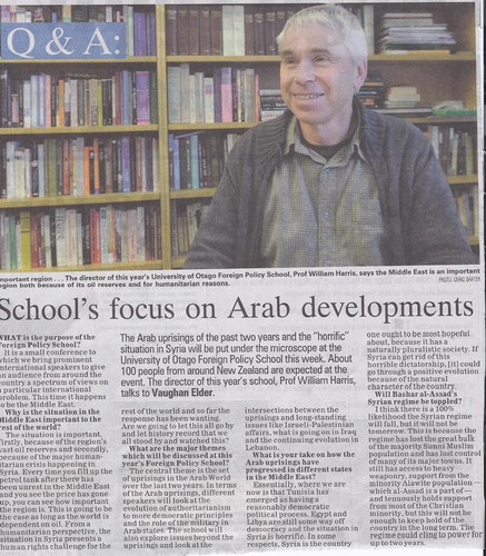 Here are two articles involving Bill Harris. One is from the ODT & the other from D-Scene (links to articles below). Bill talks about the Otago Foreign Policy School examining the Middle East's uprisings. ODT Article: See pictures below